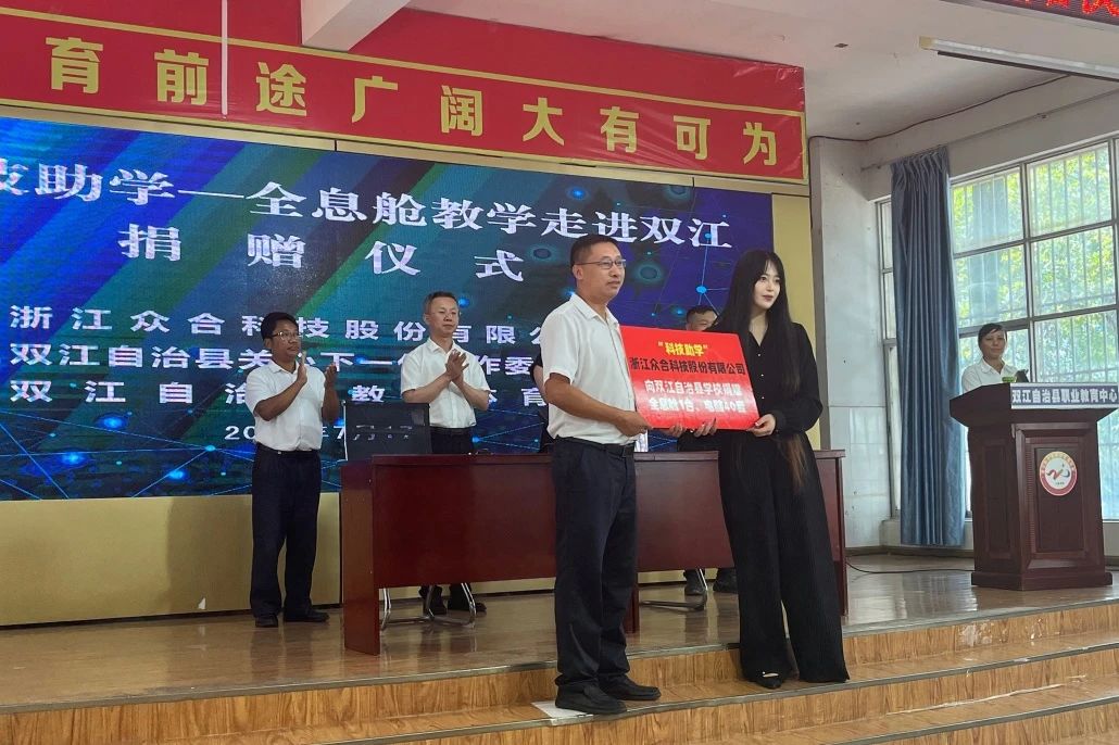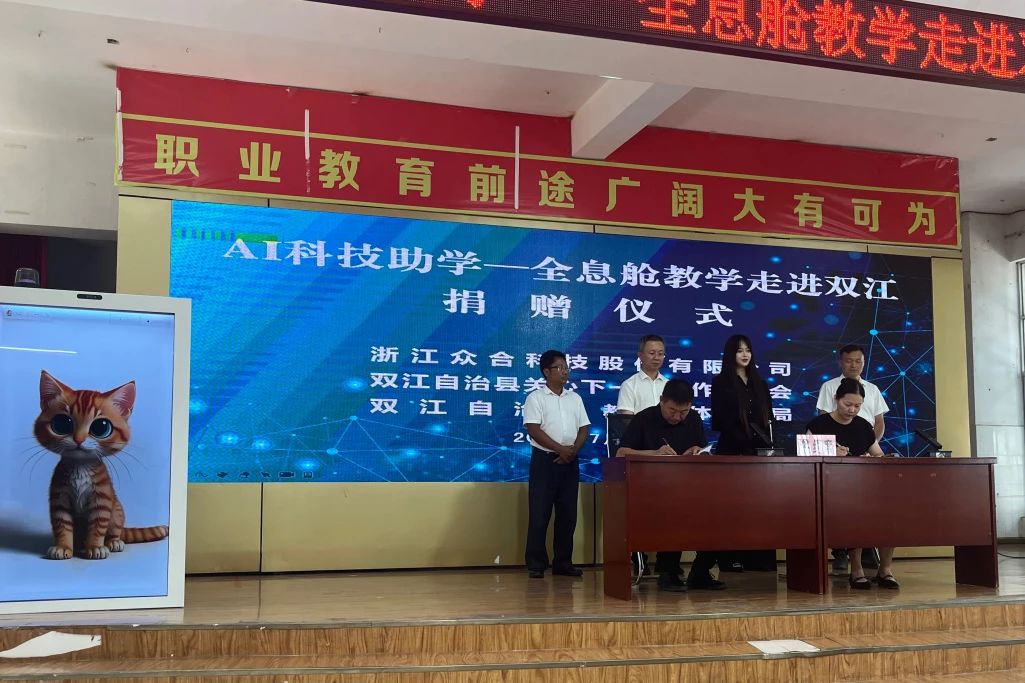 7月初,當(dāng)臨滄市委書記杜建輝率團考察眾合科技時,雙江自治縣便與眾合科技達成了戰(zhàn)略合作,雙方約定在科技助學(xué)、科技助農(nóng)、自然資源保護開發(fā)及茶產(chǎn)業(yè)數(shù)字化等領(lǐng)域展開深度合作?;谶@一合作共識,今日,云南省臨滄市雙江自治縣職業(yè)教育中心報告廳內(nèi),“AI科技助學(xué)——全息艙教學(xué)走進雙江”捐贈儀式溫暖啟幕。這不僅是眾合科技ESG行動計劃的又一次重要實踐,更為雙江自治縣的教育與農(nóng)業(yè)發(fā)展注入了新的科技動能。